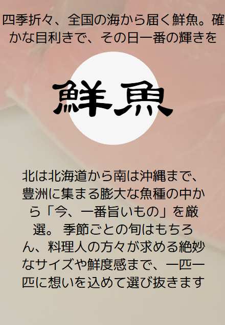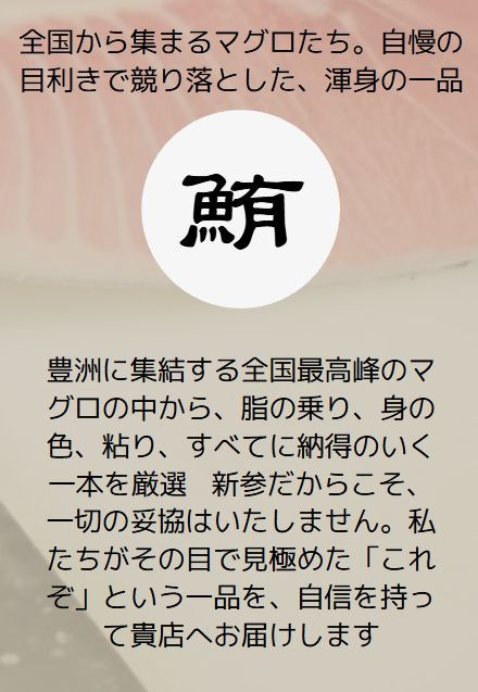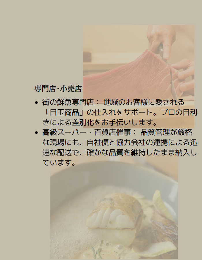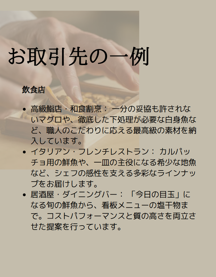 豊洲で一番、貴店の想いに寄り添う仲卸でありたい 私たちは、豊洲市場の中でも新しい組織です 歴史や伝統では老舗に及びませんが、その分、一軒一軒のお客様に対する「熱量」と「フットワークの軽さ」には自信があります「明日のこのメニューに合う魚を」「少量だけどこだわりの一匹を」といった現場の細かな声に、全力で応えます 新しい時代にふさわしい、最高のパートナーを目指しています 取り扱い品 都内は自社便で朝一番に届ける 私たちは自社便をフル活用し、都内近郊の飲食店様へ文字通り「市場の熱気」が残る時間帯にお届けします新参ならではのフットワークの軽さを活かし、急な追加発注や細かな時間指定にも、できる限り柔軟かつ迅速に対応貴店の厨房の一部として、必要な時に必要な分だけ、確実にお運びします